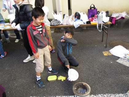 火を起こし、炭に燃え移らせるのが大変。煙たい中、頑張ってます。