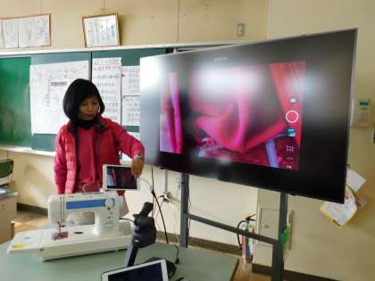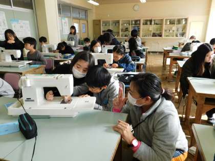 家庭科室では、5年生が初めての「ミシン縫い」に挑戦中でした。ICT機器を使って説明されていてわかりやすかったです。