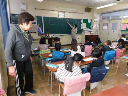 1年2組では、漢字練習の真っ最中でした。専門員の先生もサポートに入ってくれています。