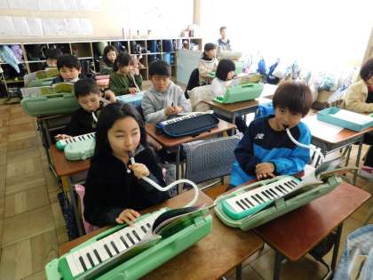 どれどれと教室に入ると、みんな真剣に練習中。「こぎつね」を吹いていました。