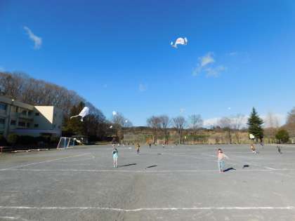絶好の凧揚げ日和でした。最初は長く伸ばしすぎ、糸からまりもありましたが、だんだんと上手にあげられるようになっていきました。