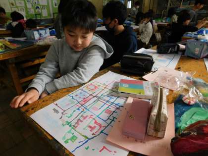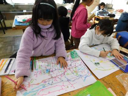 絵具をたらして、流れた模様を道や川に見立て、そこに様々な風景を足していきます。