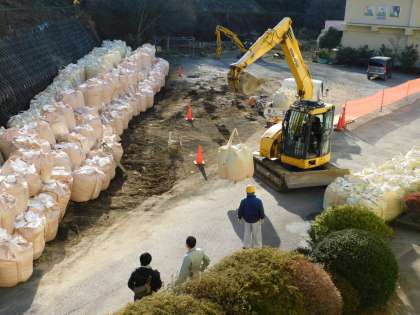 校舎側に積んであったトン袋も、斜面側に移動させます。これで工事が完了です。8日(土)には工事が終わります。