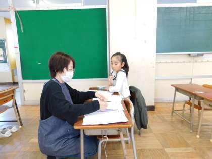 今日はお休みが1名しかいませんでした。また、今日初めて登校した子もいました。朝の健康観察を養護教諭の先生がしてくれています。