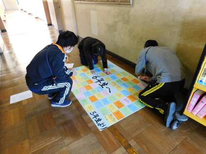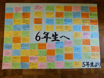 5年生が描いてくれた6年生へのメッセージを、3人の担任の先生が張ってくれていました。当日は体育館入り口に貼りました。
