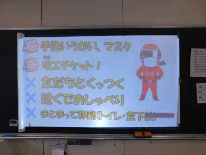 休み時間中は、ホワイトボードに写真のようなルールが映しだされ、子供たちに注意喚起しています。