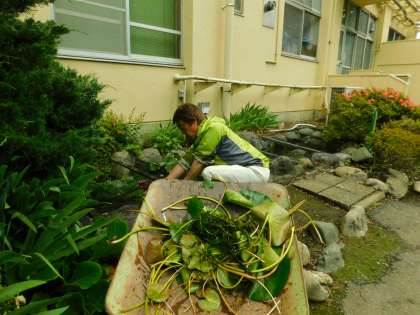 職員玄関わきの池では金魚が元気に泳いでいます。数年前に、アオサギに食べられ数を減らしましたが、用務主事さんが網を張ってくれたおかげで、たくさん増えました。