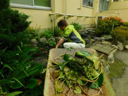 池にはきれいな「水連」の花が咲いています。しかし、根を張るので、それを間引いてくれています。
