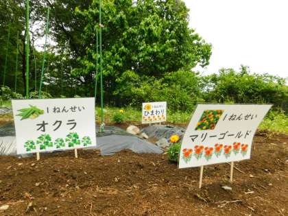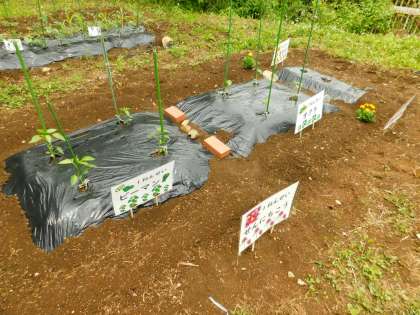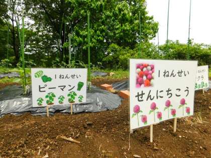 こちらは1年生の畑です。生活科で使います。前回紹介した時は、植えたばかりでしたが、今日は、名札がしっかりと飾られていました。