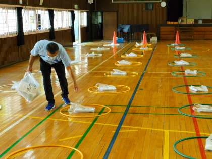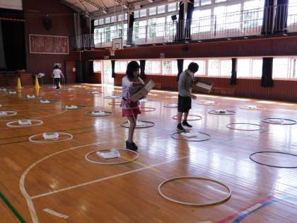 3年生に続いて登校するのは、4年生です。先生方が手分けして配布物を準備しています。