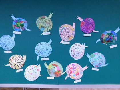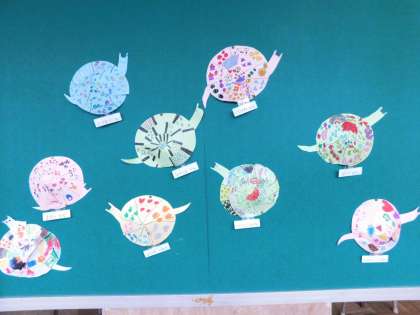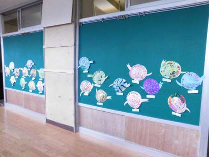 2年生の廊下には、休業中の課題(作品)がはられていました。