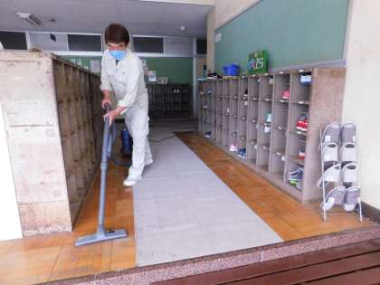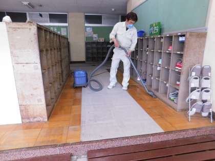 6年生の昇降口です。用務主事さんが掃除機をかけてくれていました。