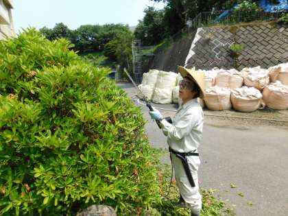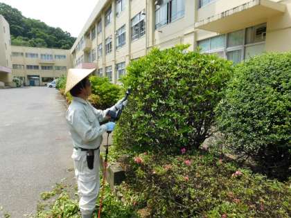 用務主事さんがきれいに刈り込んでくれている最中でした。暑い中の外作業です。ありがとうございます。