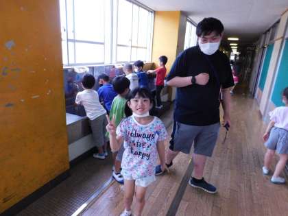 学校探検を終えた1年2組の子たちが、手洗い中です。