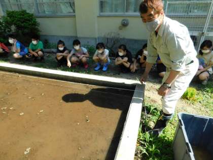 6月10日、5年生が田植え活動を行いました。当日は学校運営協議会会長さんや稲を準備したくださった方、田んぼの準備をしてくれた用務主事さんも参加してくれました。