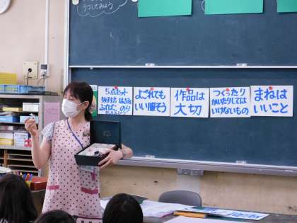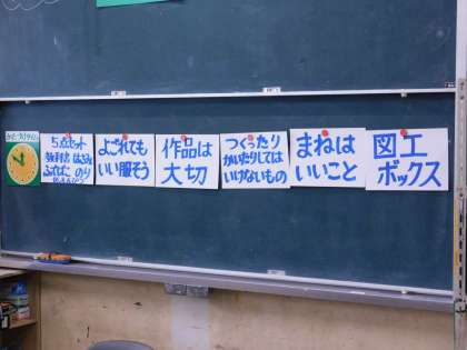 図工の先生は新しい先生です。図工室のルールや授業で大切なことを黒板に張り出して説明していました。