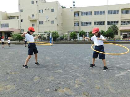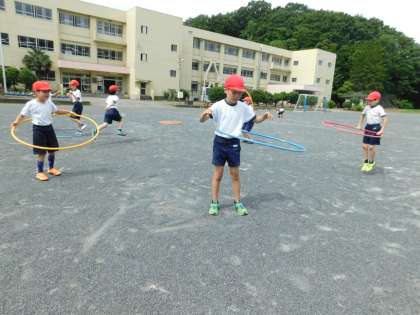 1組の50m走の裏側では、2組の子供たちがフラフープに挑戦していました。