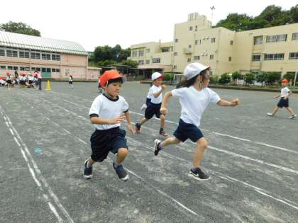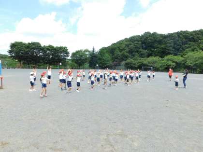 6月23日、1年生が初めての50m走に挑戦しました。まずはしっかり準備運動です。