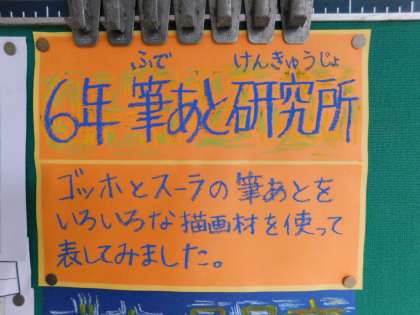 6年生が取り組んでいる作品が、図個室前に掲示されていました。題して「6年 筆あと研究所」だそうです。