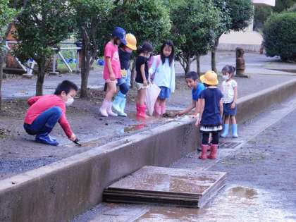 雨上がりの校庭は、お楽しみがいっぱいです。流れる水の働きを学習した4年生は、水たまりを改造中。低学年の子が、その様子を見ています。