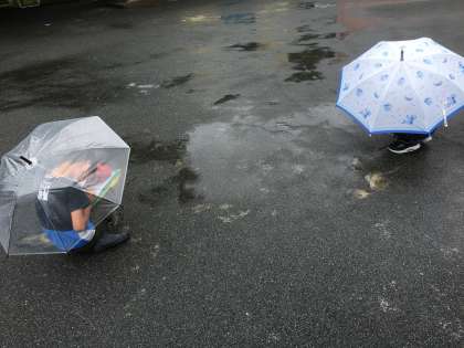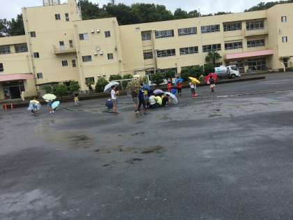 雨が少しやんだので校庭で水たまりや、流れている雨水の様子を観察しました。