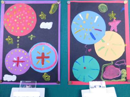 大きさの違う丸い色画用紙を使いました。色は各自が選びました。