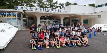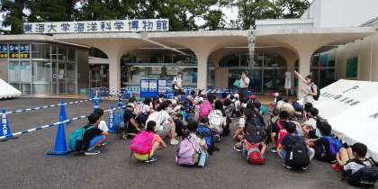 東海大学海洋博物館に着きました。まずはクラス写真を撮りました。その後、ウミホタルの発光実験をします。