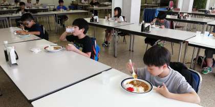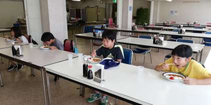 食堂も密を防止するような座席になっています。クラスごとにお昼です。