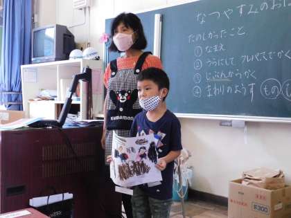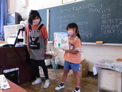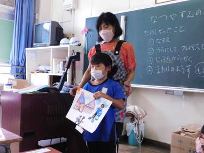 1年2組では夏休みの思い出を描き、どんなことが楽しかったか、絵をもとに発表していました。