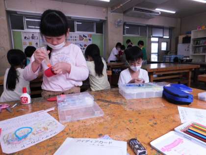 図工室では、4年3組の子が「すてきな遊び場」というテーマで作品の下絵を描いていました。次回からは実際に作っていくそうです。