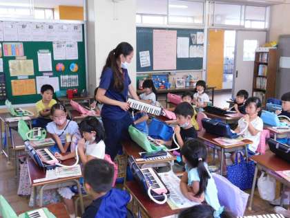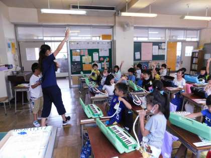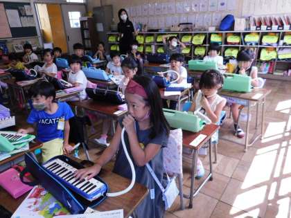 1年1組では音楽の授業でした。鍵盤ハーモニカでタンギングの練習をしていました。