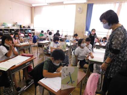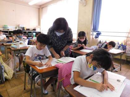 2年2組は、講師の先生が書写を教えてくれています。みんなきれいな字で書いてました。