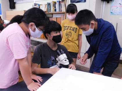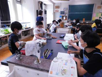 理科室では6年3組が、顕微鏡を使って、池の水の中身を調べていました。見つけるのは大変そうでした。