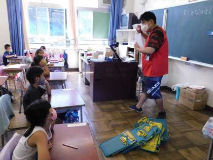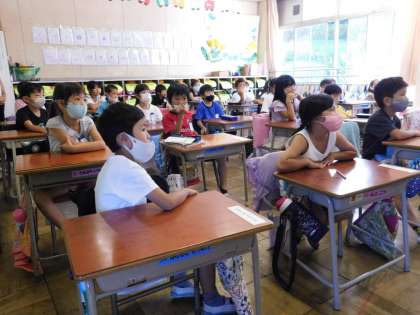1年2組の生活科授業風景です。これから校庭に、虫を探しに行きます。パックに入れて観察し、記録するそうです。