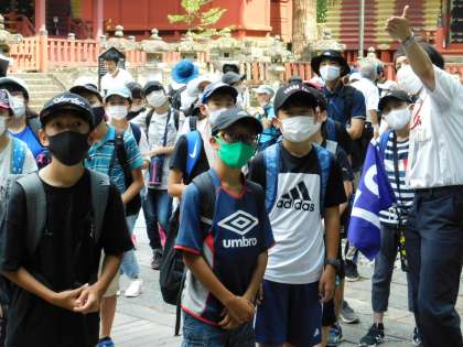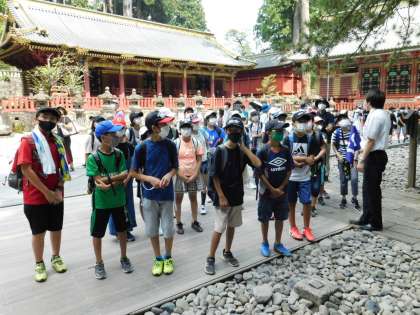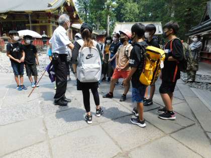 三猿が有名ですが、建物を取り囲むように、猿の彫物がしてあります。人の一生を表しているようですね。ガイドさんから説明を受けています。