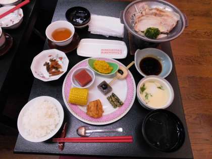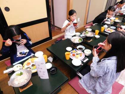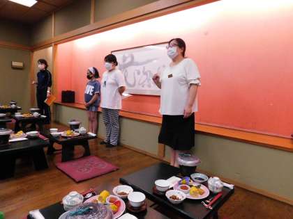 避難訓練や入浴を済ませ、お待ちかねの夕食です。まずは、メニューの説明がありました。