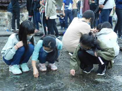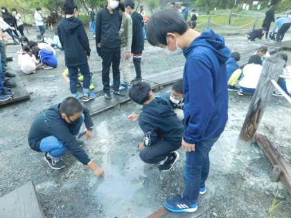 班ごとに10円玉をお湯に入れ、色の変化を見てます。