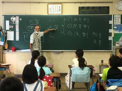 当日は台風の影響で雨が降ったり止んだりとはっきりしない天気だったので、残念ながら川での実習はなくなりましたが。教室で、楽しお話をしていただきました。