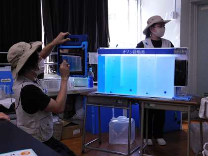 水道水のにおいを消すために行われている「高度浄水処理(オゾン処理)」の模型を使って水がきれいになるところも見せてもらいました。