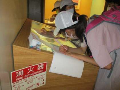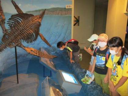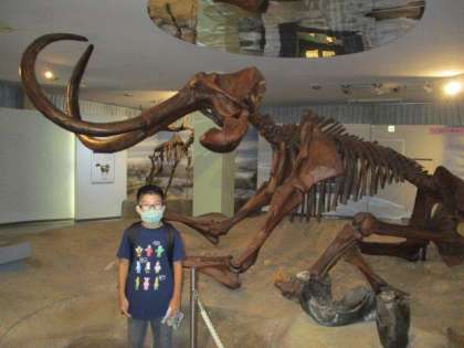 一生懸命、しおりにまとめているグループも。感心、感心。マンモスの骨格標本をバックに記念撮影。