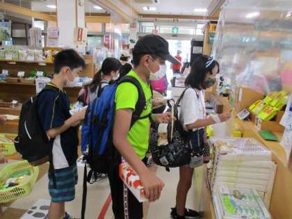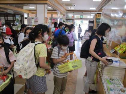 さすがに、レジ前は混雑中。先生も一緒に買い物をしています。さあ、最後の食事です。メニューは何かな。