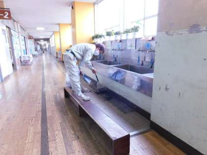 用務主事さんが、1年生教室前の水道の踏み台を修理してくれています。
