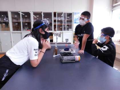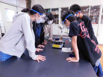 塩酸に、アルミニウムなど金属を溶かした液体を蒸発させるとどうなるかの実験です。みんな予想を立てて、観察です。