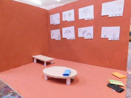 家の中、片方は保育園だそうです。園児が描いた絵がリアルに貼られていますね。