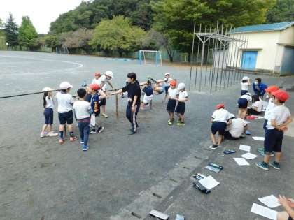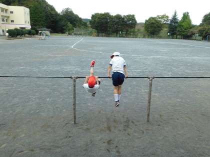 3年1組は鉄棒の授業でした。学習カードを使って、出来る技を確かめています。技を披露してくれる子もいました。