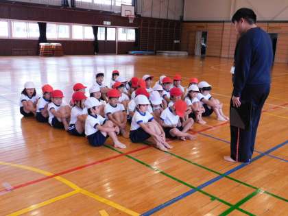 1年2組の体育の授業です。今日は新採の先生の授業を、育成担当の先生に指導してもらいます。
