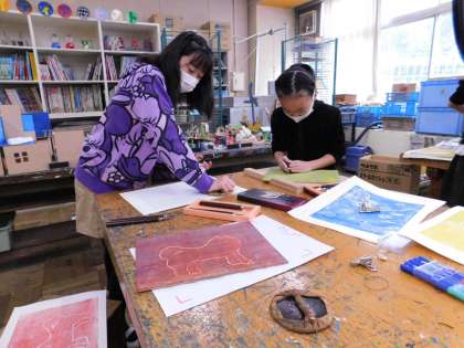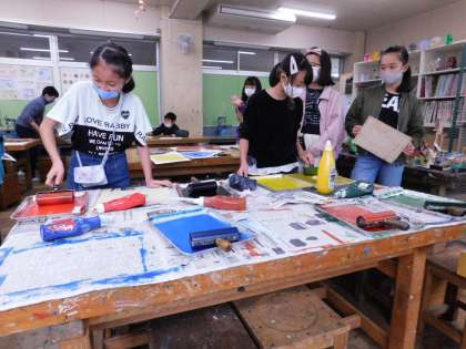 色付けをした後、紙を重ね、バレンでしっかりこすります。