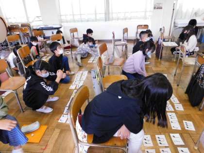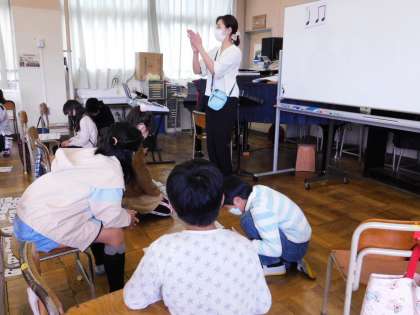 5年1組の子が音楽の授業を受けていました。先生がたたいた拍子を、リズムカードで表します。