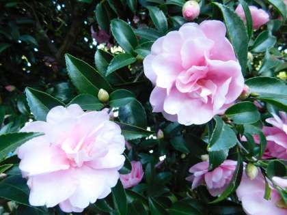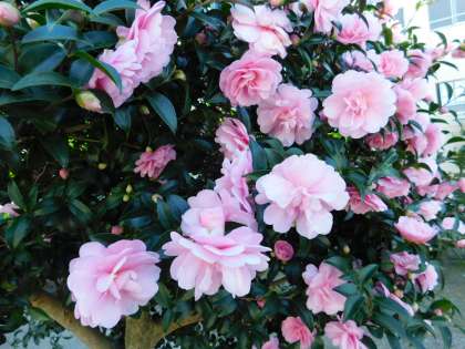 校庭に植えられているツバキの花が、一木だけ花を咲かせていました。満開です。ほかの木も蕾が大きくなっていました。