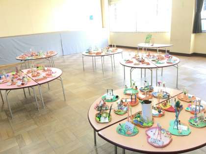 また、同時に1F「多目的室2」では立体、3F「第2音楽室」廊下には平面と図工の作品を展示してあります。こちらも是非ご覧ください。